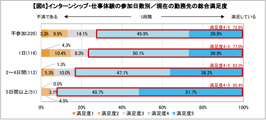 また、入社後の満足度はインターンシップ・仕事体験の参加日数にも相関している点も注目すべきポイントです【図6】。インターンシップに不参加や1日に対して、2~4日間または5日間以上のインターンシップ・仕事体験に参加している学生の方が、現在の勤務先の満足度が高い傾向にあります。