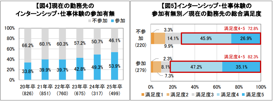 また、【図5】を見ていただくと、インターンシップ・仕事体験に参加した学生を採用する方が、現在の勤務先への満足度が高くなりやすいと考えられます。