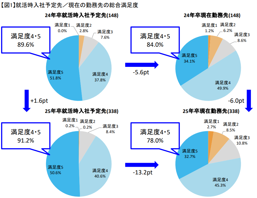一方で、「現在勤務先」つまり「入社後」の段階では、24年卒学生の満足度が84.0%に対して、25年卒学生は78.0%となり、6.0pt減少しています。