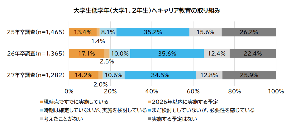 昨年の採用ウォッチでも低学年向けのキャリア教育の重要度についてお伝えしていましたが、マイナビさんの調査データからも、28卒向けのキャリア形成支援活動だけでなく、大学生低学年(大学1~2年生)や、高校生・中学生・小学生向けのキャリア教育への取り組みが増えていることがわかりました。