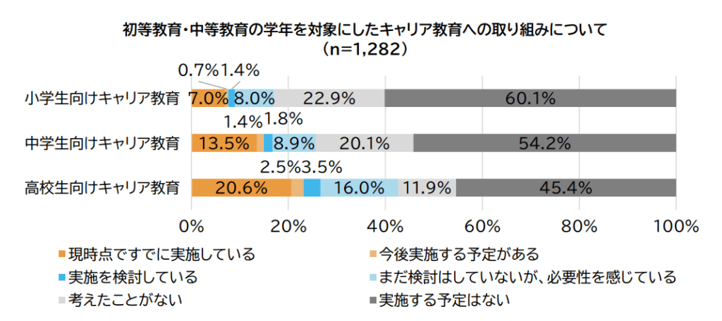 高校生・中学生・小学生向けのキャリア教育について、「現時点ですでに実施している」と回答した企業の割合は、高校生向けでは20.6%、中学生向けでは13.5%、小学生向けでは7.0%との結果が出ています。