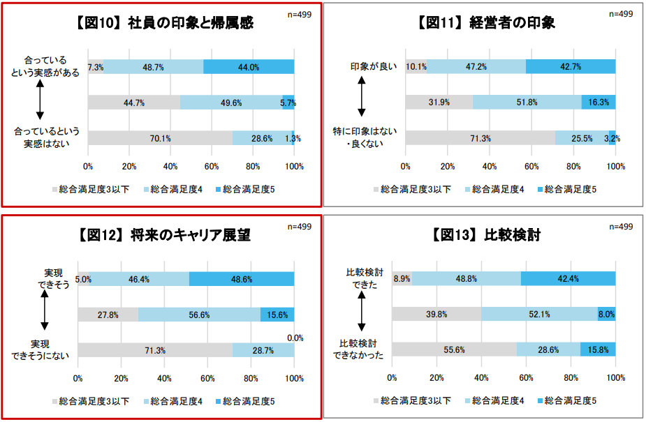 同調査において、入社後の満足度が高い層と低い層につき、「労働条件、職場環境の満足度」「能力を活かせるか」「社員の印象と帰属感」「経営者の印象」「将来のキャリア展望」「比較検討」の6項目で比較した結果、特に強い相関性が見られた要素が「社員の印象と帰属感」、「将来のキャリア展望」でした。