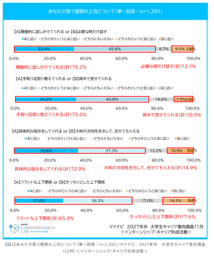 採用ウォッチ12月でも、Z世代とゆとり世代の就活生の違いについて、リクルートマネジメントソリューションズさんとリンクアンドモチベーションさんの調査データを基に、昨今の学生には「とりあえずやってみる」ではなく、「なぜこの業務が必要なのか」という理由とセットでの説明、「なぜやるか」の納得感の重要性をお話しました。そのような傾向からも、現在の学生が求める「理想の上司像」が読み取れるかと思います。